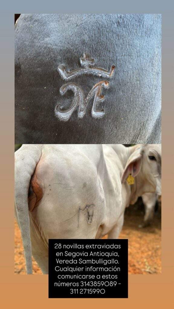 Valledupar, 12 de agosto de 2025.-Un nuevo caso de abigeato se reportó en zona rural del municipio de Segovia, Antioquia, donde cuatreros aprovechando la distancia y el cobijo de la maleza, hurtaron 28 novillas de una hacienda en la vereda Sambulligallo. Los animales están identificados con marcas visibles en la piel: una “M” coronada y una “M” sencilla en la parte posterior, como se aprecia en las imágenes difundidas por los propietarios en varios grupos de ganaderos de la región.